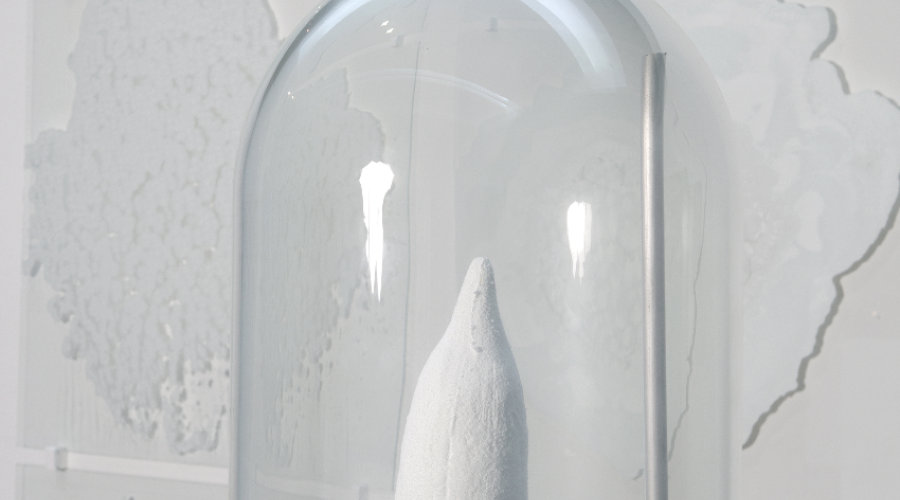 Video dokumentacija (grijač, vakuumska pumpa, metalna konstrukcija, gips, kofeinska kristalna skulptura, silikonske cijevi, električni kablovi, kupola od borosilikatnog stakla, posuda od boroksilikatnog stakla, škripac, voda), 2012.