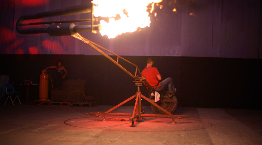 Od nađenih, jeftinih, recikliranih, odbačenih, doniranih ili pribavljenih predmeta kojih se dočepamo konstruiramo interaktivne kinetičke skulpture i tražimo od publike sudjelovanje umjesto promatranja. Našim radom nastojimo proizvesti iskustvo primarne egzistencije koje, iako kratkotrajno, pobuđuje interes na nov način i konkretizira iskustvo umjetnosti van esteticizma. U vremenu u kojemu mladi ljudi pate od pomanjkanja pažnje i koncentracije te u vremenu medijski izazvanog straha, nastojimo koristiti oruđa kojima raspolažemo kako bismo načinili spektakl kojega je moguće istinski doživjeti jedino uživo. Bljuvostroj je interaktivna kinetička skulptura koja vrti sudionika 65 km/h unatrag na invalidskim kolicima, a pokreće ju pulsni mlazni motor stvarajući buku jačine 120 decibela.