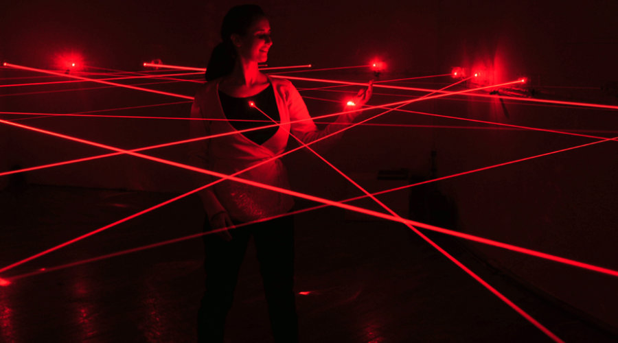 Mjesto boravka je audio-vizualni sustav koji nastaje interakcijom 16 izvora laserske svjetlosti, jednog računala u komunikaciji sa sustavom optičkih senzora, te X posjetitelja čije kretanje aktivira zvuk i uspostavlja jednu, u beskonačnom nizu mogućih i uvijek novih, privremenih varijacija/transformacija 'mjesta'. Tako stvoreni ambijent nije prostor ili mjesto kojemu se mogu odrediti dimenzije i koordinate: on je prije svega 'prenosivi' sustav ili princip koji funkcionira poput virusa. Prilagođavajući se s jednakom učinkovitošću bilo kojem prostoru nositelju, pretvara svakog od njih istovremeno u statičnu metaforu globaliziranog, umreženog informacijskog društva, ali i igralište na kojemu se i unutar kojega se ono 'izvježbava'. Iako mijenja oblik, mreža se uvijek sastoji isključivo od svjetla. Laserske zrake postaju nositelji apsolutne vidljivosti: one ne samo da generiraju svjetlost nego (uz pomoć optičkih senzora) i vide, dojavljujući svaku prisutnost i pokret tijela središtu sustava.